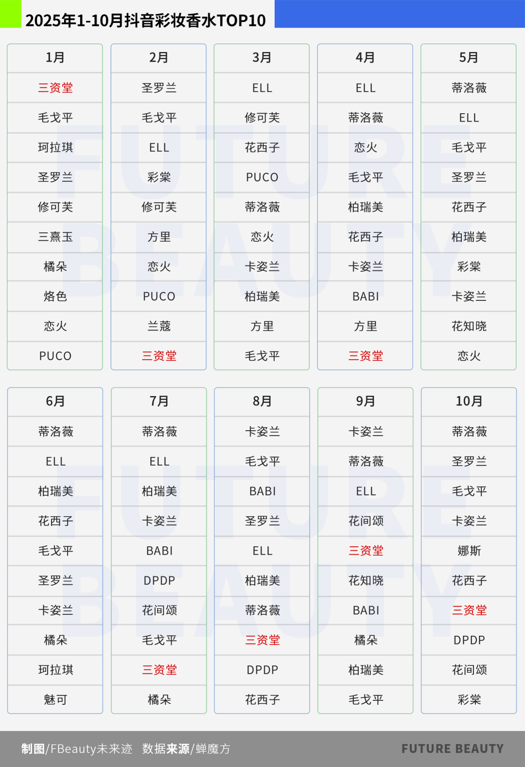 從業(yè)績上看,三資堂從去年起便持續(xù)穩(wěn)居抖音彩妝前列,今年1月更是成為抖音彩妝香水銷量Top1品牌,且過去10個月中有7個月的銷量均登上TOP10榜單。