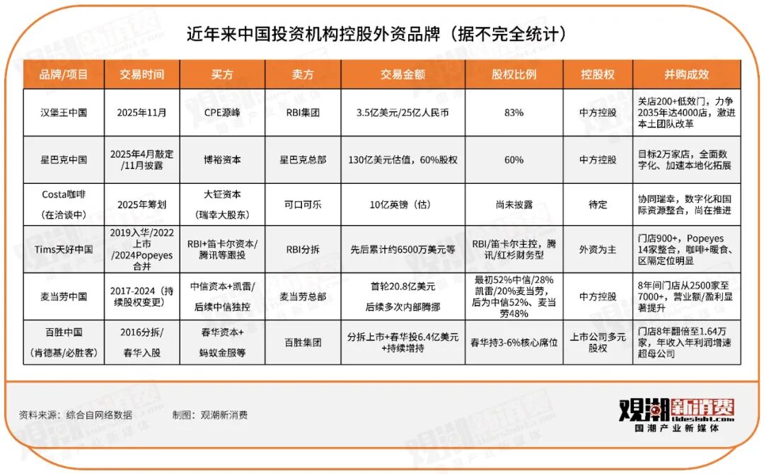 博裕資本收購星巴克中國60%股權(quán),合資公司估值40億美元(約合人民幣284.11億元);CPE源峰為漢堡王中國注入3.5億美元(約合人民幣24.86億元),拿下83%控股權(quán),中信資本將麥當(dāng)勞中國持股增至52%。這些交易的背后,是中國資本對國際品牌價值的冷靜重估:品牌遺產(chǎn)必須通過本土化改造才能重新變現(xiàn)。