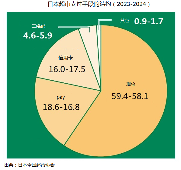 日本全國超市協(xié)會的報告中顯示,2023年到2024年,客戶支付手段排第一位的都是現(xiàn)金,從2023年的59.4%到2024年的58.1%,基本穩(wěn)定,只收現(xiàn)金的店鋪占比從4.4%升至5.5%。對于引入或增加非現(xiàn)金支付工具的意愿,2022年為55.5%,2023年為45.7%,2024年為45.9%,積極性逐年降低。2024年11月份的調(diào)查顯示,居然有2.2%表示想要停止目前的非現(xiàn)金支付系統(tǒng)。