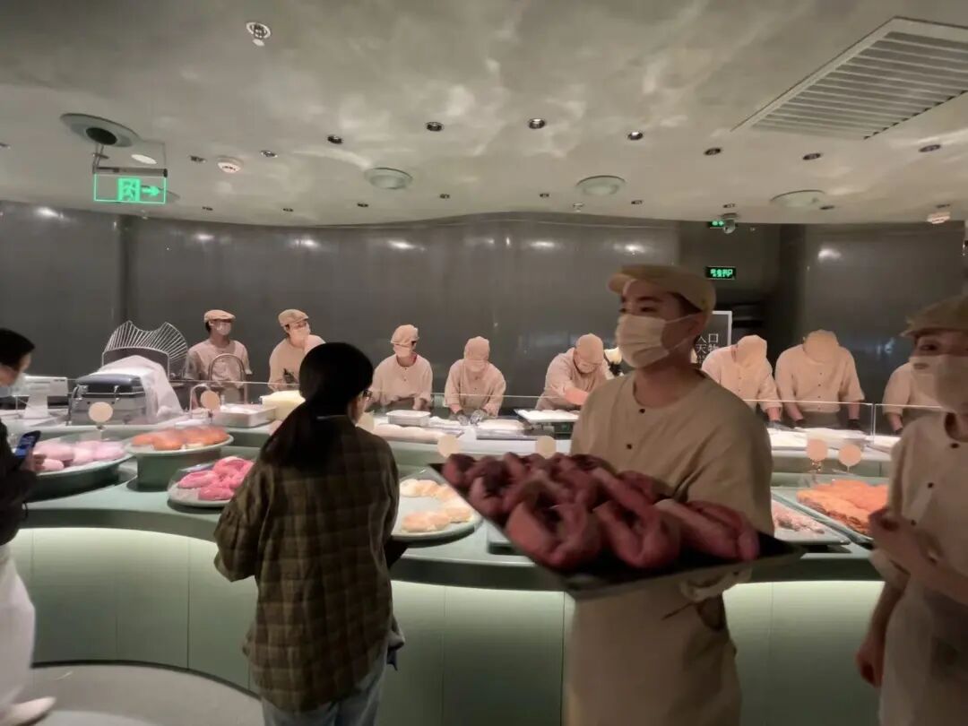 不過,這種全流程展示也對門店運營提出了更高要求。據(jù)職餐記者觀察,僅前場專職烘焙師就配置了20余位,疊加前廳服務(wù)與引導(dǎo)崗位,單店總?cè)肆σ殉^40人。