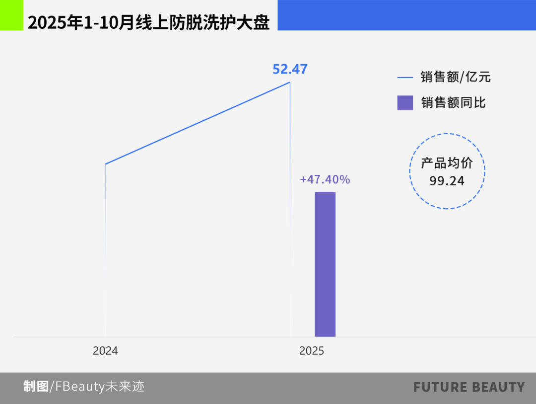 再來看市場大盤,根據(jù)2025年1–10月最新數(shù)據(jù),防脫洗護市場僅十個月的銷售額就達到52.47億元,已經(jīng)超過2024年全年46.77億元,同比增幅超過47%。銷量從去年的約4.8億件上漲到今年的5.29億件。量在漲、價也在漲,商品平均單價從約97.4元提升到接近100元。
