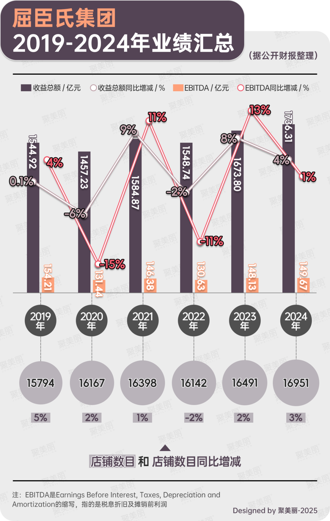從財(cái)報(bào)來看,屈臣氏集團(tuán)在全球及中國(guó)市場(chǎng)的表現(xiàn)均不盡如人意。從下圖來看,屈臣氏集團(tuán)雖在2024年創(chuàng)下店鋪數(shù)量高峰,但仍難掩頹勢(shì)——收益額、EBITDA(稅息折舊及攤銷前利潤(rùn))雙雙增速放緩,且在2019-2024年期間還出現(xiàn)多次業(yè)績(jī)下滑。