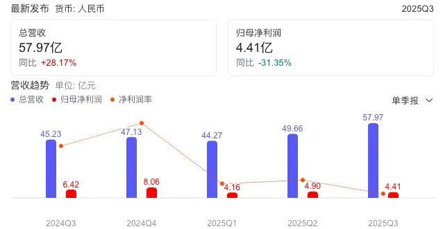 本季度歸母凈利潤僅為4.41億元,直接以同比下滑近31.35%,一舉超越今年Q1同比下滑28.52%的紀錄,創(chuàng)下了自去年Q4以來的同比下滑幅度之最。