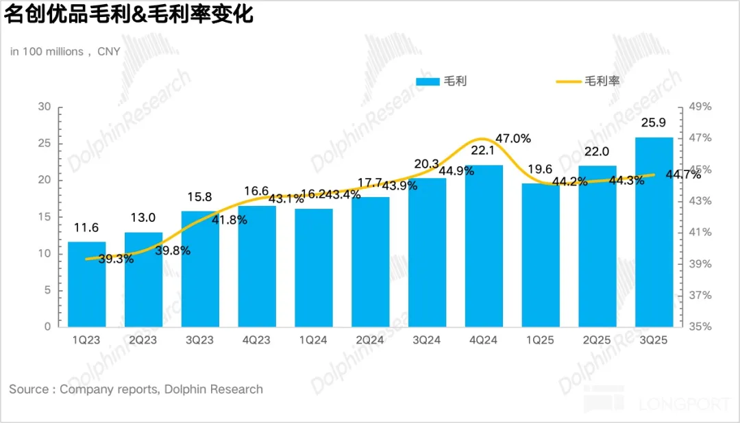 故而規(guī)模擴大疊加高增速,仍帶動著名創(chuàng)優(yōu)品品牌營收增速的整體表現。