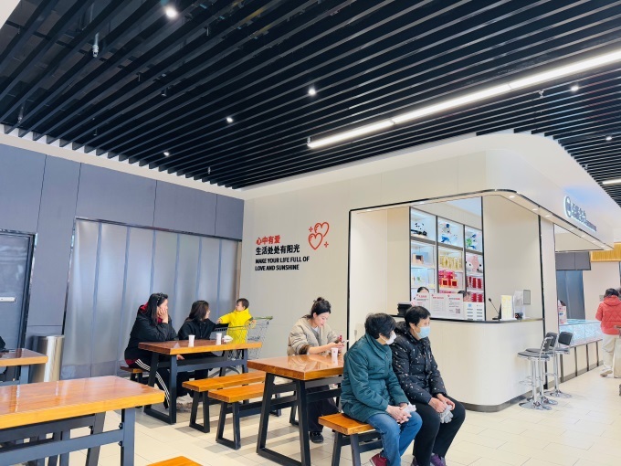 賣場環(huán)境全面升級,取消強(qiáng)制動線,主通道拓寬,貨架高度統(tǒng)一降至1.6米,營造開闊通透的購物氛圍。便民服務(wù)區(qū)配備身高體重測量儀、血壓儀、洗手池、直飲水機(jī)、微波爐等三十余項設(shè)施,提供多口味暖心熱茶,并設(shè)有寵物安置區(qū)與堂食桌椅,方便顧客邊吃邊逛,感受社區(qū)溫情。