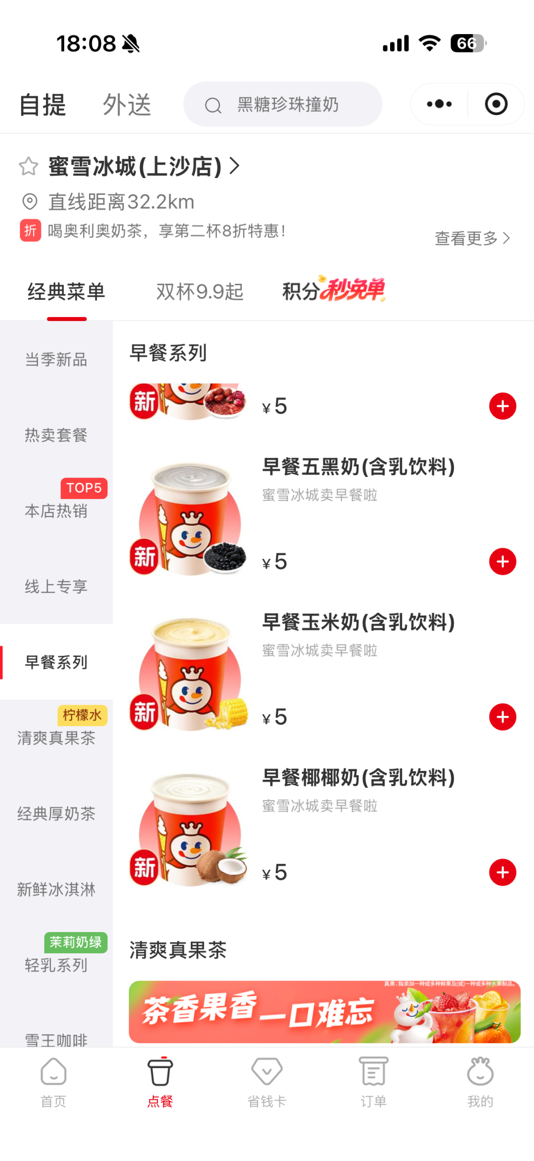 茶咖觀察通過蜜雪冰城官方小程序進一步驗證,發(fā)現(xiàn)杭州上沙店確實已上線“早餐系列”。目前產(chǎn)品包括早餐五紅奶、早餐五黑奶、早餐玉米奶和早餐椰椰奶四款,售價均為5元,與爆料信息吻合。