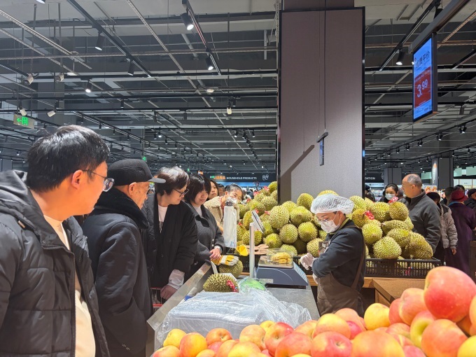 水果區(qū)作為生鮮重點,主推明蝦、阿克蘇蘋果、干堯榴蓮、云南藍莓等國內(nèi)外品質(zhì)果品。其中,當季熱銷的砂糖橘源自云南高原海拔500米以上核心產(chǎn)區(qū),得益于超2000小時的充足日照,果徑嚴格篩選在40毫米以上,確保了果實飽滿、口感甜而不膩。熟食板塊匯聚多款現(xiàn)場制售的人氣產(chǎn)品,九多肉多招牌香辣豬蹄以其香辣過癮、軟糯Q彈、膠質(zhì)豐富的特點成為解饞佳品;熱鹵甜腸堅持現(xiàn)煮出鍋,香氣撲鼻,一口爆汁更過癮,牢牢抓住了年輕食客的味蕾。烘焙區(qū)則主打榴蓮千層蛋糕、雙拼瑞士卷、榴蓮大福等暢銷單品,憑借真材實料、動物奶油與高性價比,迅速成為家庭采購與年輕消費群體的追捧焦點。