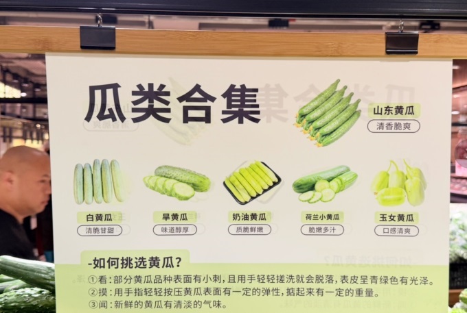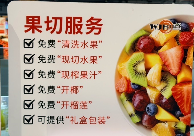 顧客服務(wù)方面,門店的服務(wù)細(xì)節(jié)亦盡顯匠心。水產(chǎn)區(qū)現(xiàn)撈瀝水、宰殺以及打氧服務(wù);肉禽柜臺提供免費(fèi)的切絲、切片、絞肉服務(wù);水果區(qū)提供清洗、分切、榨汁、開椰、禮盒包裝等貼心服務(wù);連卷袋旁設(shè)有濕手器與防扎手套,處處可見對顧客體驗(yàn)的細(xì)致關(guān)照。店內(nèi)還有商品介紹、挑選技巧、烹飪菜單等一系列的主題卡片和溫馨提示,為顧客提供極大便利。