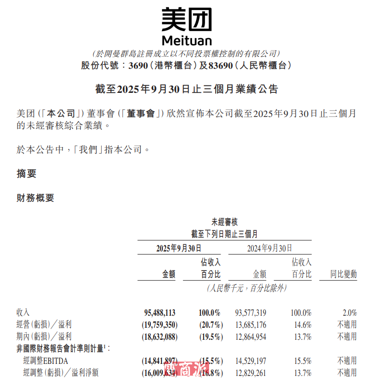 美團(tuán)發(fā)布2025年第三季度業(yè)績(jī)報(bào)告