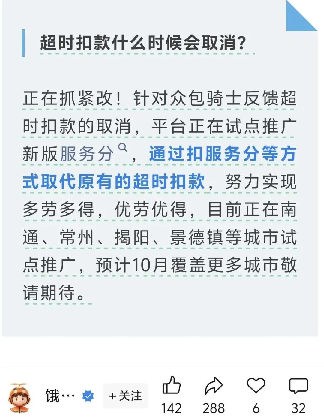 而在一個(gè)多月前,京東外賣也宣布已在深圳、南京、哈爾濱、武漢等全國(guó)25個(gè)城市試點(diǎn)取消騎手訂單超時(shí)罰款,轉(zhuǎn)為啟用“服務(wù)分”管理機(jī)制。
