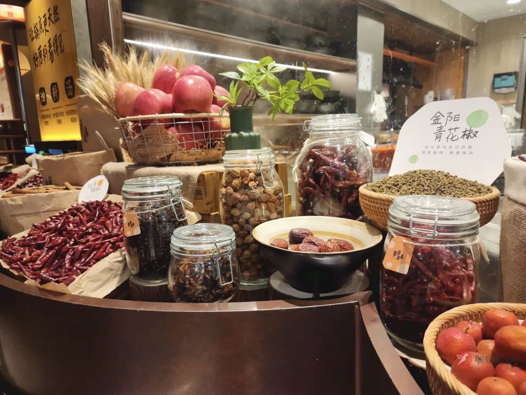 鍋底檔口陳列金陽青花椒、茂汶紅花椒、貴州艷辣等各種辣椒與香料,手作甜品、鮮榨果蔬檔口也將新鮮果蔬作為堆頭直接陳列,強(qiáng)調(diào)真材實(shí)料。