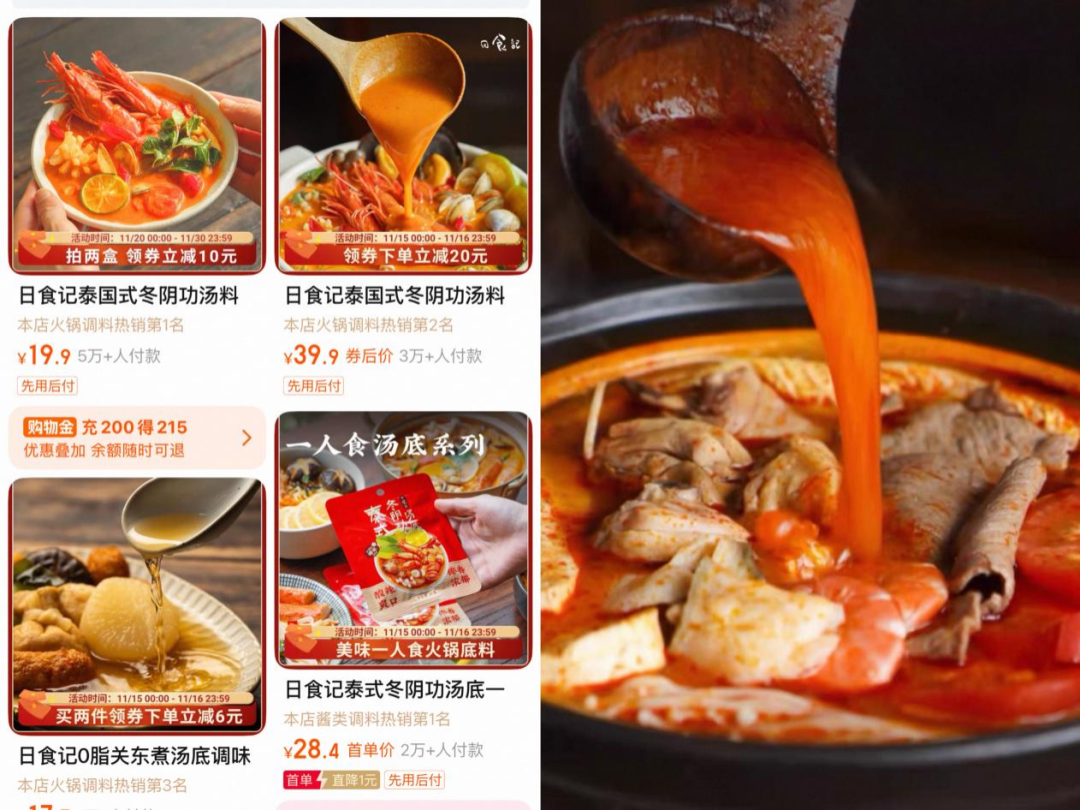 全網(wǎng)粉絲量超7700萬的美食博主“日食記”,2021年就推出火鍋底料,現(xiàn)在店鋪內(nèi)的特色口味火鍋底料有13種,包括冬陰功風(fēng)味、貴州紅酸湯底、貴州豆米火鍋底料等。天貓雙11第一波品牌銷售額同比去年增長了超50%。