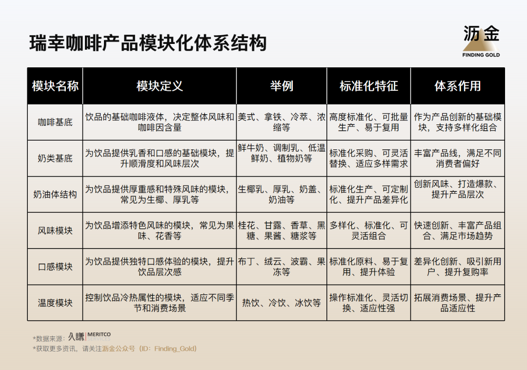 與此同時,瑞幸的模塊化產(chǎn)品庫,讓新品開發(fā)不再是“從零開始”,而是“排列組合”。一個成功模塊(例如生椰基底),不僅帶來銷量,更會成為后續(xù)數(shù)十款產(chǎn)品的基礎(chǔ)模塊,被寫入模塊庫。