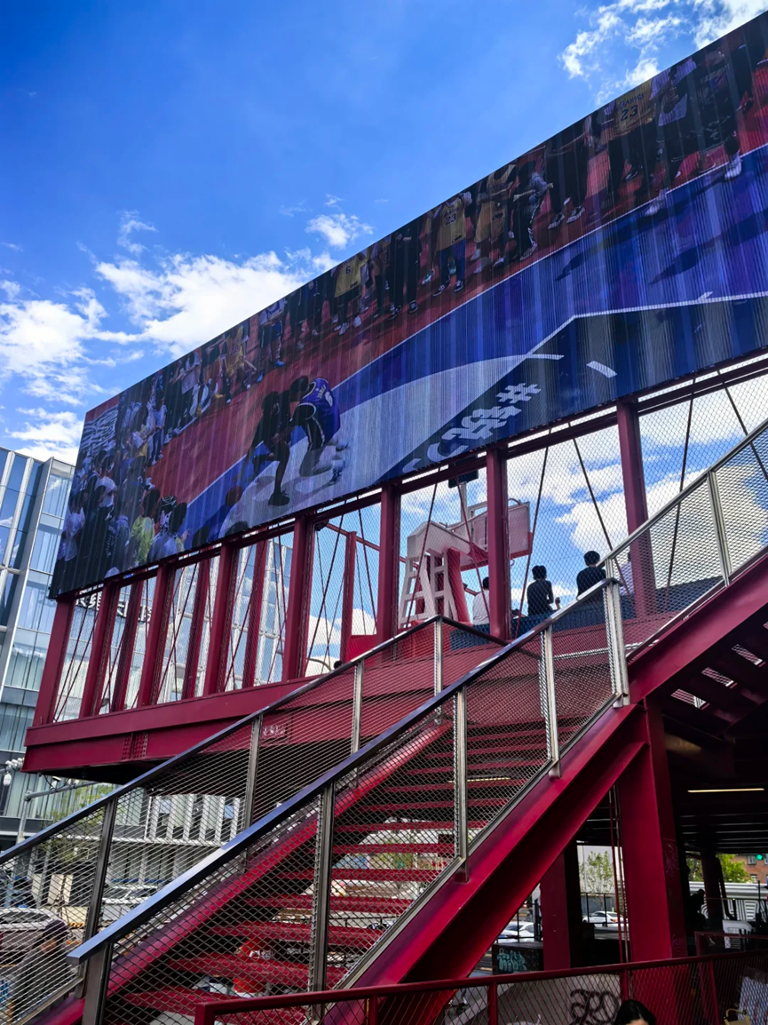 精心設(shè)計的氛圍能自然引導(dǎo)人流、減少銷售依賴、激發(fā)自發(fā)分享。良好的綠植與休憩區(qū)減少消費(fèi)者疲勞感,提升復(fù)購率;具有視覺沖擊力的雕塑或裝置成為“天然打卡點(diǎn)”,帶來免費(fèi)社交媒體曝光;一句精準(zhǔn)的Slogan(如“年輕力中心”)能讓媒體、KOL、消費(fèi)者在傳播時自動帶上標(biāo)簽,形成統(tǒng)一認(rèn)知。下圖就是北京朝外THE BOX A館門口的戶外籃球場,構(gòu)成了商場獨(dú)特的外觀和經(jīng)營口號的宣揚(yáng)。