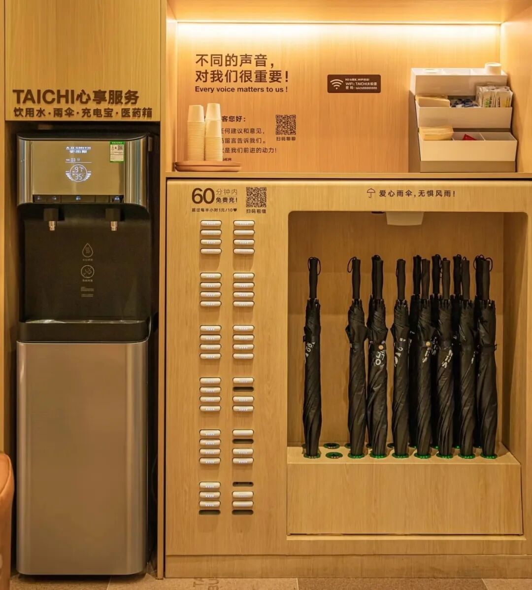 而在服務(wù)上,太極堡門店也頗為貼心,設(shè)置寄存柜,提供免費Wifi、冷熱水、牙線、發(fā)圈、充電寶,雨天有愛心雨傘,收獲不少顧客好評。