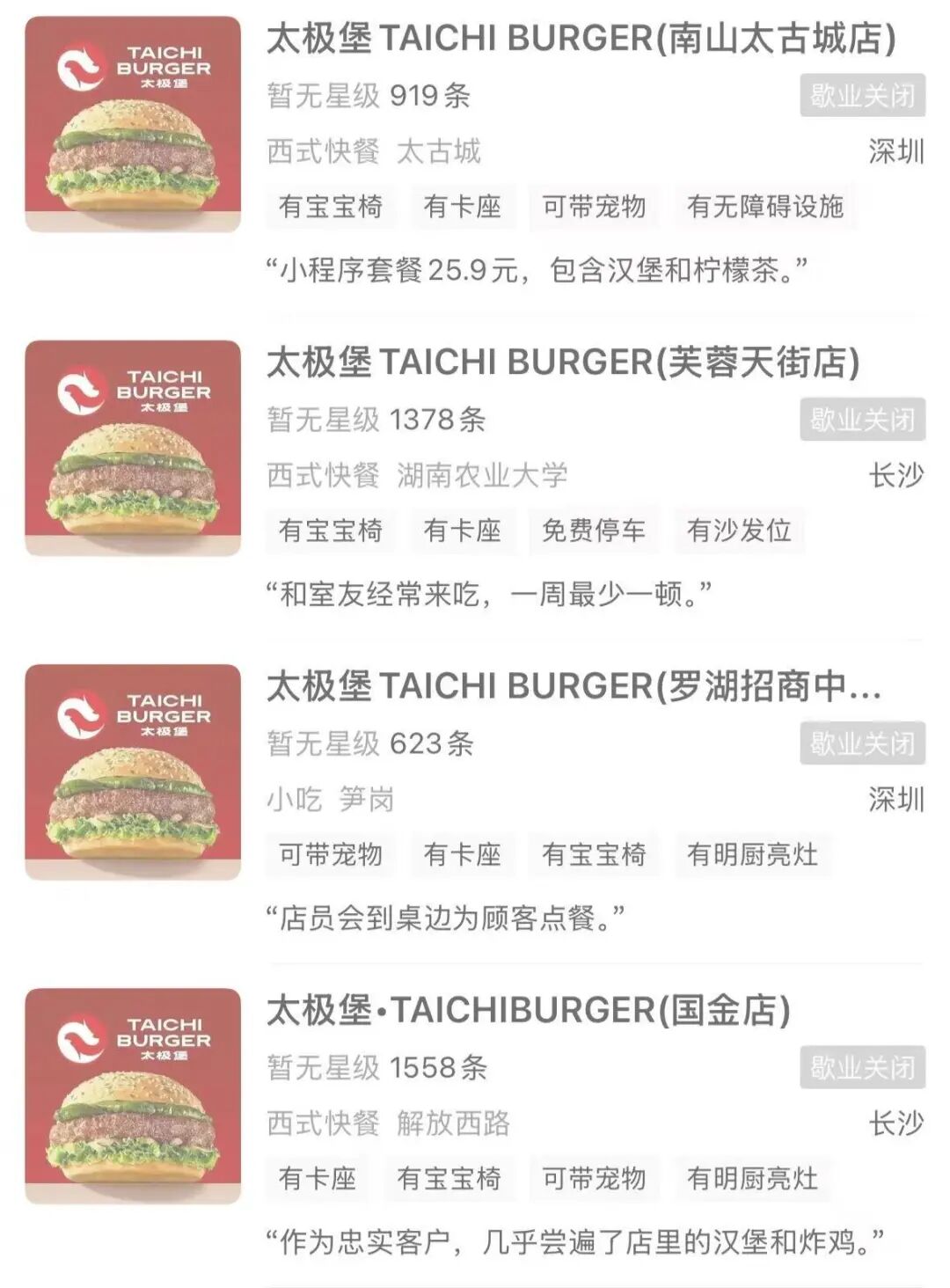 大眾點評顯示,截至目前,太極堡在營門店共7家,其中深圳5家、長沙2家,與8月份公開資料顯示的17家門店對比,短短3個月便關(guān)停了10家門店,關(guān)店比例近六成。