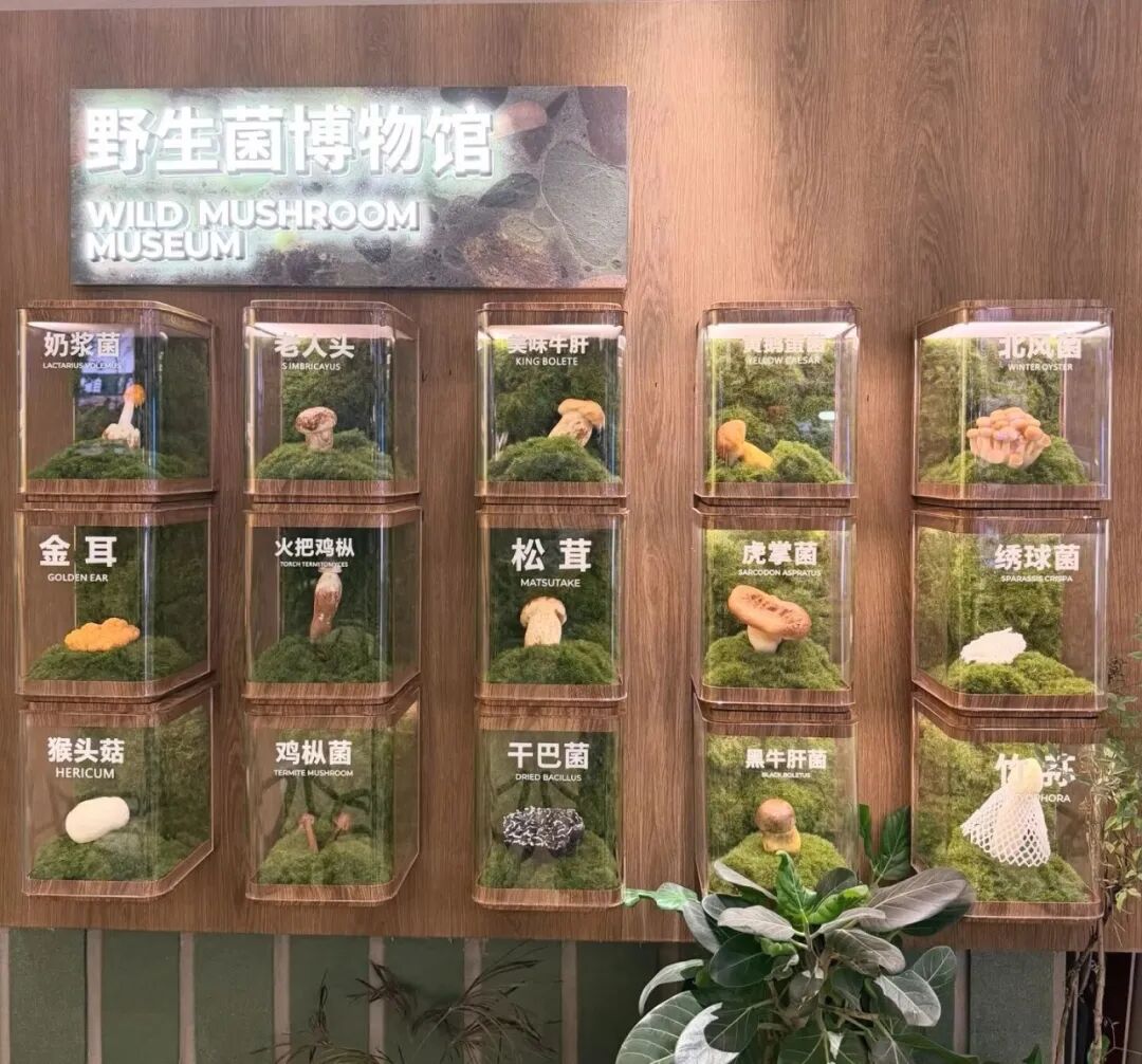 以“蕓山季”為例,品牌就在入口處設(shè)置了一面“野生菌”主題墻,通過(guò)青苔基底、松茸與雞樅菌等放大模型,結(jié)合自然光感,營(yíng)造出一處微縮的云南山野景觀。