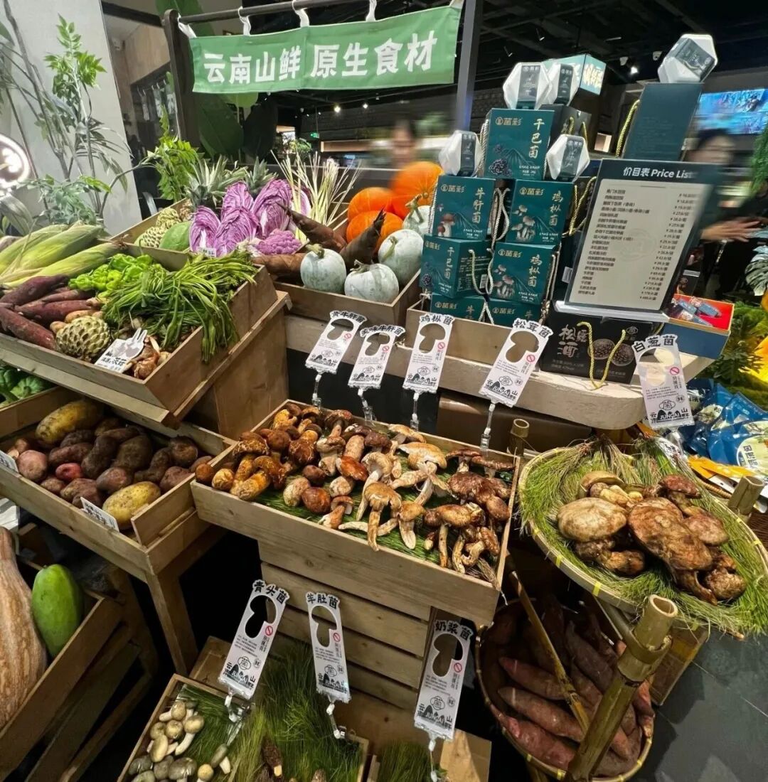 以“蕓山季”為例,門(mén)店入口設(shè)置野生菌展示區(qū),帶著泥土氣息的雞樅菌、松茸、白蔥菌被整齊地陳列在籃子里;菜單與墻面上,“食材每日空運(yùn)到店”“野生菌采于云南3000米高山”“北緯27°的天然饋贈(zèng)”等標(biāo)語(yǔ)在門(mén)店隨處可見(jiàn),持續(xù)強(qiáng)化消費(fèi)者對(duì)食材新鮮度與原產(chǎn)地的認(rèn)知。
