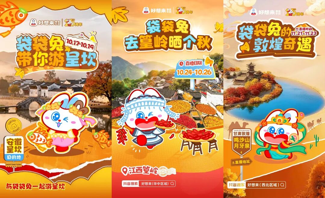 作為好想來的核心IP,品牌形象“袋袋兔”在前期的宣發(fā)中就完成了多次“變身”: 如黃山呈坎專場的漢服魚燈造型、江西婺源專場的民族服飾造型等,與地域特色形成呼應;直播現(xiàn)場,主播也會換上當?shù)靥厣珚y造 —— 婺源專場的曬秋文化、敦煌專場的絲路風情……讓品牌符號與文旅場景自然融合。