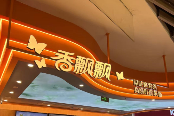 從門店裝修來(lái)看,香飄飄的實(shí)體門店延續(xù)其品牌標(biāo)志性的暖橙色主色調(diào),門頭上“香飄飄”三個(gè)大字旁邊還嵌入了不少“蝴蝶元素”,整體設(shè)計(jì)自帶“古早回憶”的風(fēng)味。