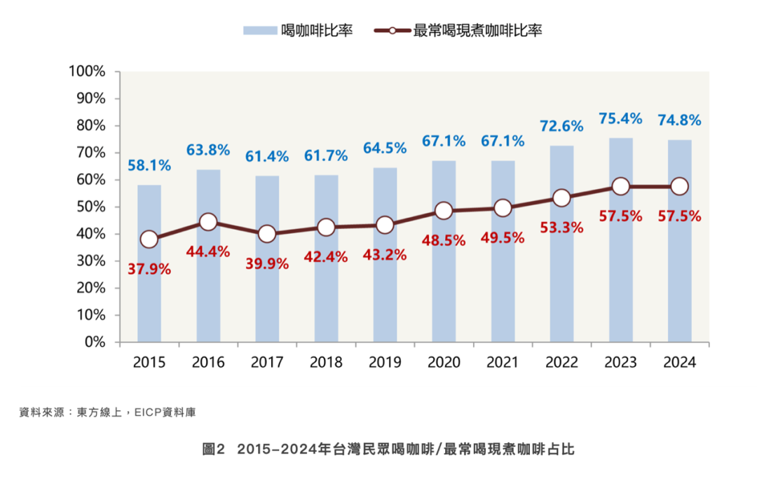 同時,2024年中國臺灣13-64歲的消費者中,喝咖啡比率達到74.8%;最常喝“現(xiàn)煮咖啡”的比例也占到總人口的57.5%。顯然,咖啡已經(jīng)變成了當?shù)叵M者最日常的飲品之一,并滲透進年輕學生、白領及中老年人等各年齡段人群的日常生活中。
