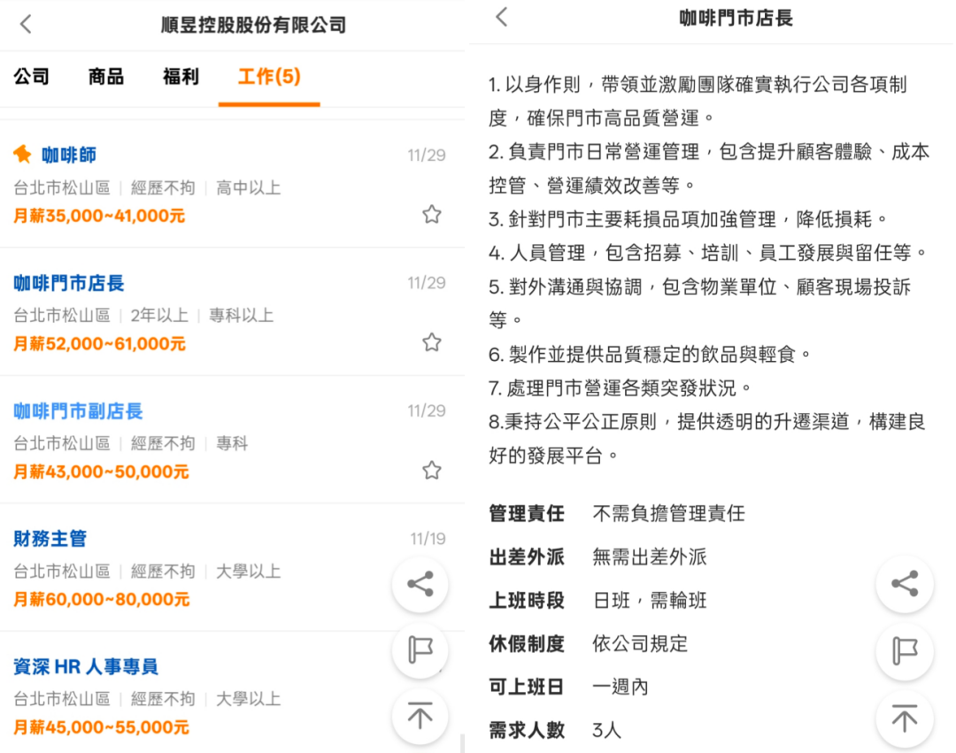 目前,該網(wǎng)傳選址門店已張貼瑞幸經(jīng)典藍白色調的招聘海報,海報附帶的二維碼指向代理公司順昱控股在臺灣招聘網(wǎng)站的官方招募頁面。公開招聘信息顯示,順昱控股正為臺灣市場招募咖啡師、店長、副店長、財務主管及資深HR人事專員等核心崗位。