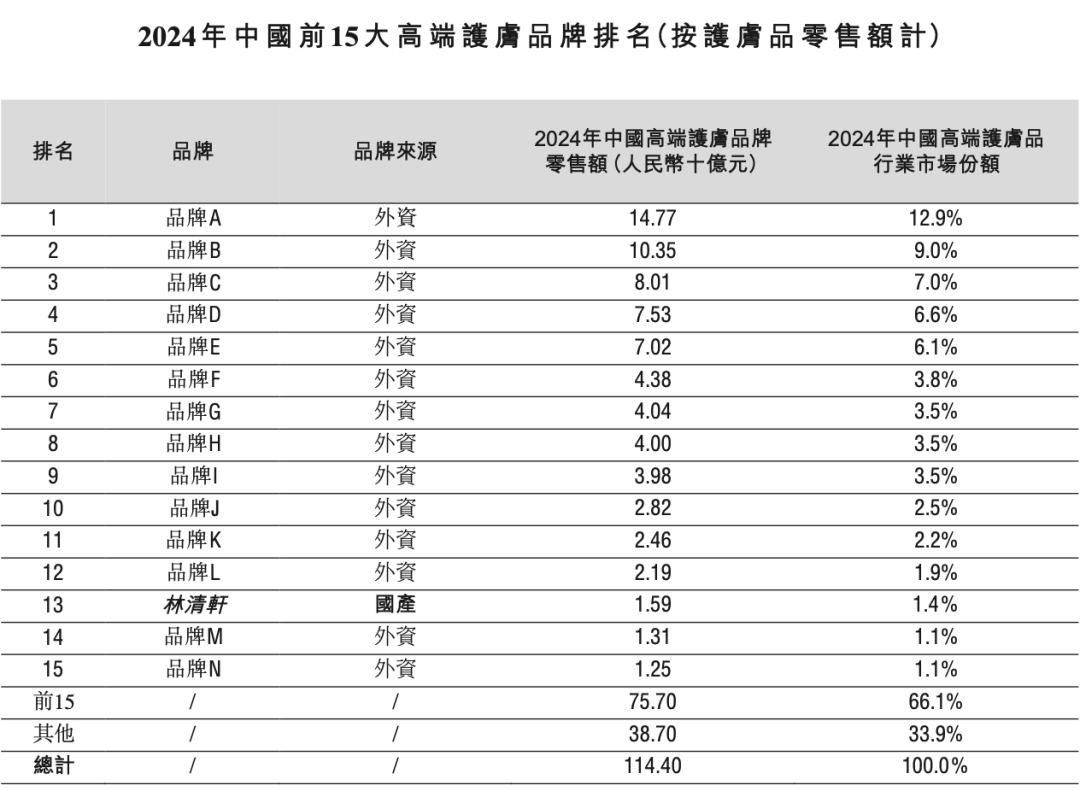 根據(jù)灼識咨詢資料,按2024年零售額計算,林清軒在中國所有高端國貨護膚品牌中排名第一,也是中國前15大高端護膚品牌中唯一的國貨品牌。