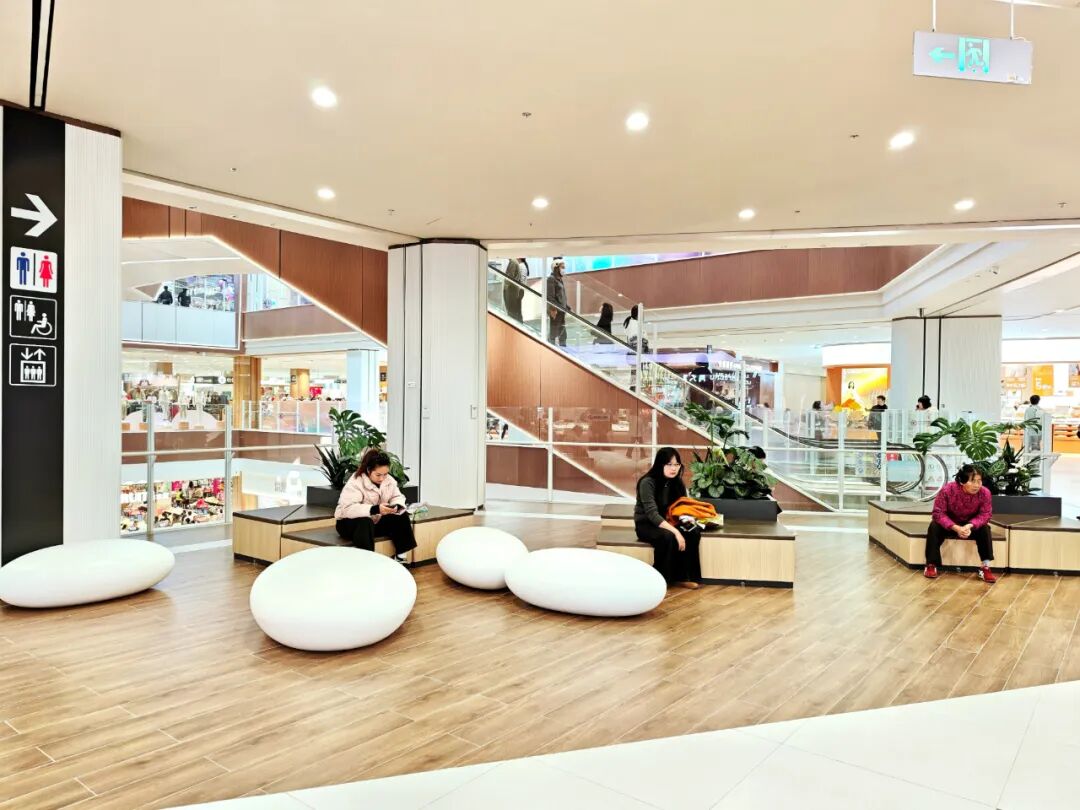 不僅有以上服務內(nèi)容,密集布置于戶外區(qū)域與商場各樓層公區(qū)的「休息區(qū)」,及在商場外及屋頂設置的「吸煙區(qū)」,皆是永旺夢樂城有別于國內(nèi)大多數(shù)商場的標志性服務內(nèi)容。