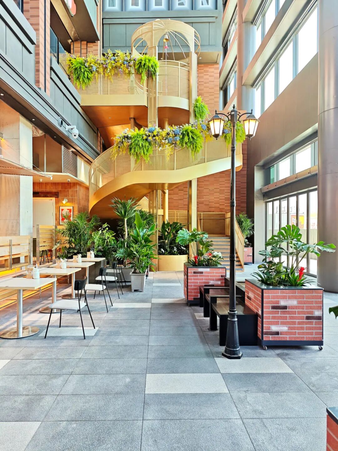項目在一樓臨戶外美食街一側,利用挑空結構的室內(nèi)廣場,以無隔斷、開放式、高顏值餐廳為視覺中心,結合外擺區(qū)與各類小吃店,構成視野開闊、通透舒展、包羅萬象的新式餐飲區(qū),將精致感與煙火氣融合得恰到好處。