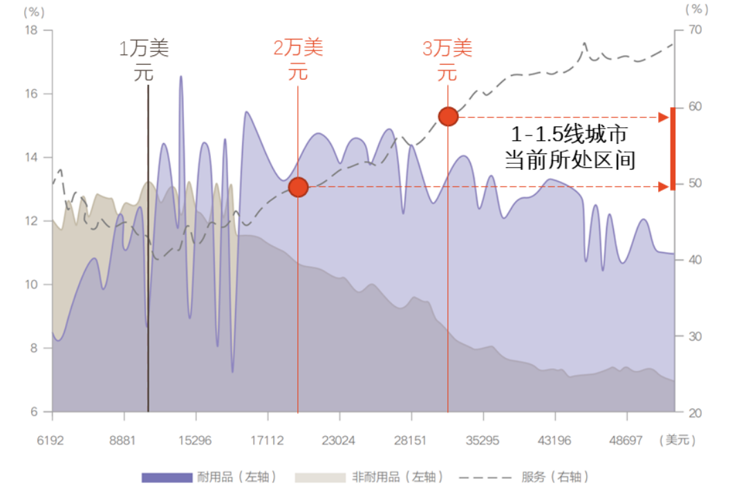 當(dāng)前,我國(guó)多數(shù)1-1.5線城市的人均GDP水平已超過(guò)2萬(wàn)美元,結(jié)合上述研究,未來(lái)這些城市的服務(wù)類消費(fèi)占比,也將會(huì)逐步超過(guò)商品類消費(fèi)占比。