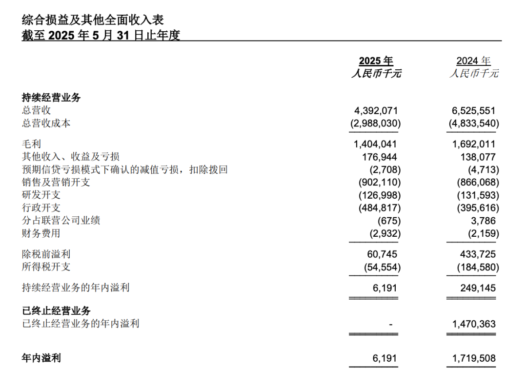 一邊是直播電商流量紅利見頂,另一邊則是公司營收連續(xù)下滑。2025財年財報顯示,東方甄選總營收44億元,同比減少32.7%;持續(xù)經(jīng)營業(yè)務(wù)凈溢利620萬元,較上年同期的2.49億元大幅下降97.5%。全渠道已付GMV從143億元降至87億元,抖音渠道訂單量由1.8億單下滑至9160萬單。
