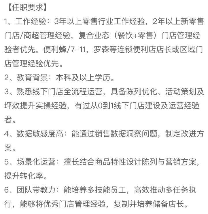 招聘啟事顯示,東方甄選對店長的要求尤為苛刻,不僅需要5年以上零售行業(yè)經(jīng)驗(yàn)、3年以上新零售門店管理經(jīng)驗(yàn),還特別強(qiáng)調(diào)“餐飲+零售”復(fù)合業(yè)態(tài)管理背景,優(yōu)先考慮便利蜂、7-ELEVEn、羅森等品牌的從業(yè)者。顯然,東方甄選迫切希望借助成熟人才快速搭建運(yùn)營體系,以彌補(bǔ)自身在線下運(yùn)營經(jīng)驗(yàn)上的短板。