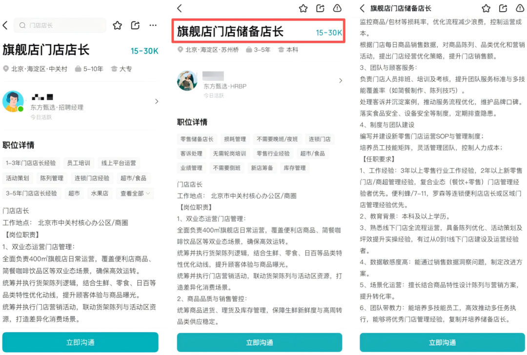 緊接著,《北京商報》12月3日披露的一則招聘啟事引發(fā)行業(yè)聚焦:東方甄選正以1.5萬至3萬元月薪,為北京首家旗艦店尋覓店長,優(yōu)先鎖定“餐飲+零售”復(fù)合業(yè)態(tài)管理人才。