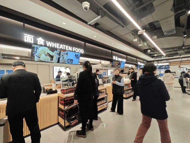 超市提供多種商品試吃,現(xiàn)場分割的挪威冰鮮三文魚,讓購物更具參與感。煙火氣十足的現(xiàn)制主食檔口提供果汁、烤地瓜、面食、炸品、便當(dāng)?shù)燃磿r餐飲,F(xiàn)場工作人員表示,過一段時間會售賣早餐,將進一步貼近日常需求。