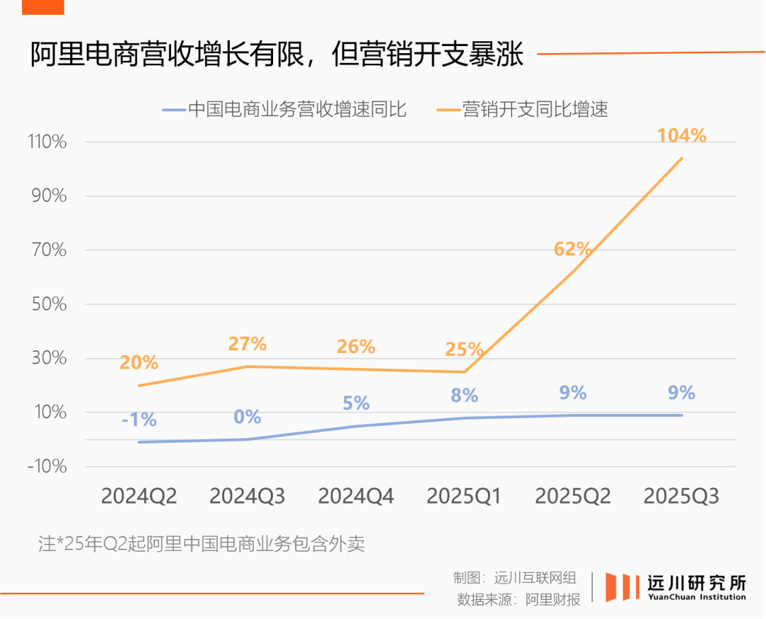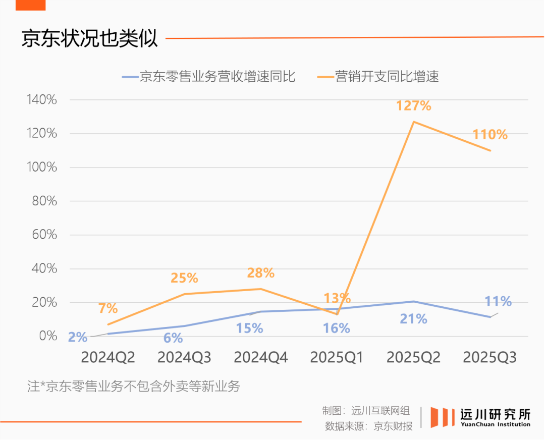 電商收入增速幾乎原地踏步,阿里將閃購(gòu)打包進(jìn)中國(guó)電商板塊,整體增速也才9%;京東在剛參戰(zhàn)的二季度,把零售增速拉上20%,轉(zhuǎn)眼三季度就已轉(zhuǎn)跌10%。