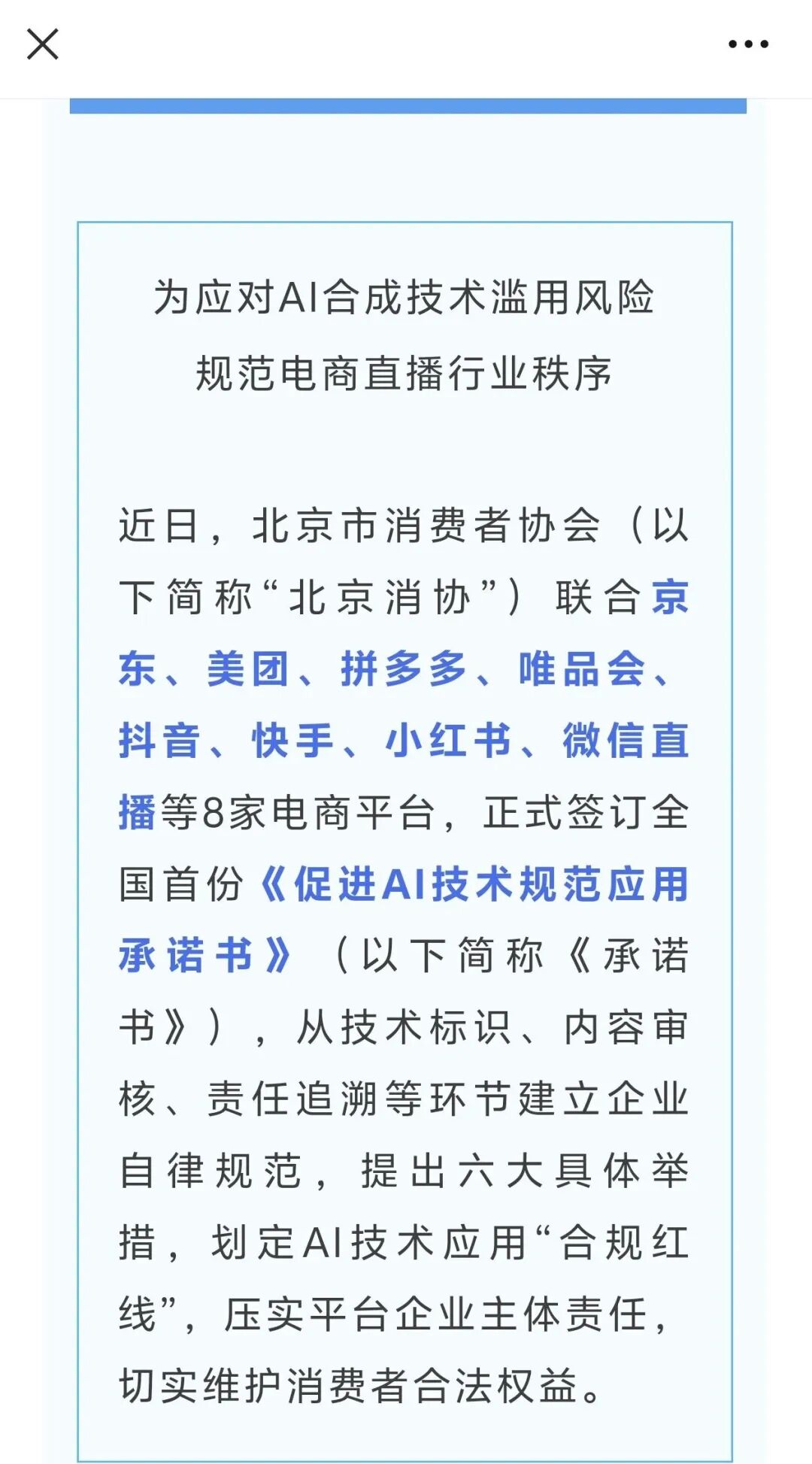 為了打擊這類AI技術(shù)濫用亂象,北京市消費(fèi)者協(xié)會(huì)聯(lián)合京東、美團(tuán)、拼多多等八大電商平臺(tái),正式簽訂全國(guó)首份《促進(jìn)AI技術(shù)規(guī)范應(yīng)用承諾書》(下稱承諾書)。