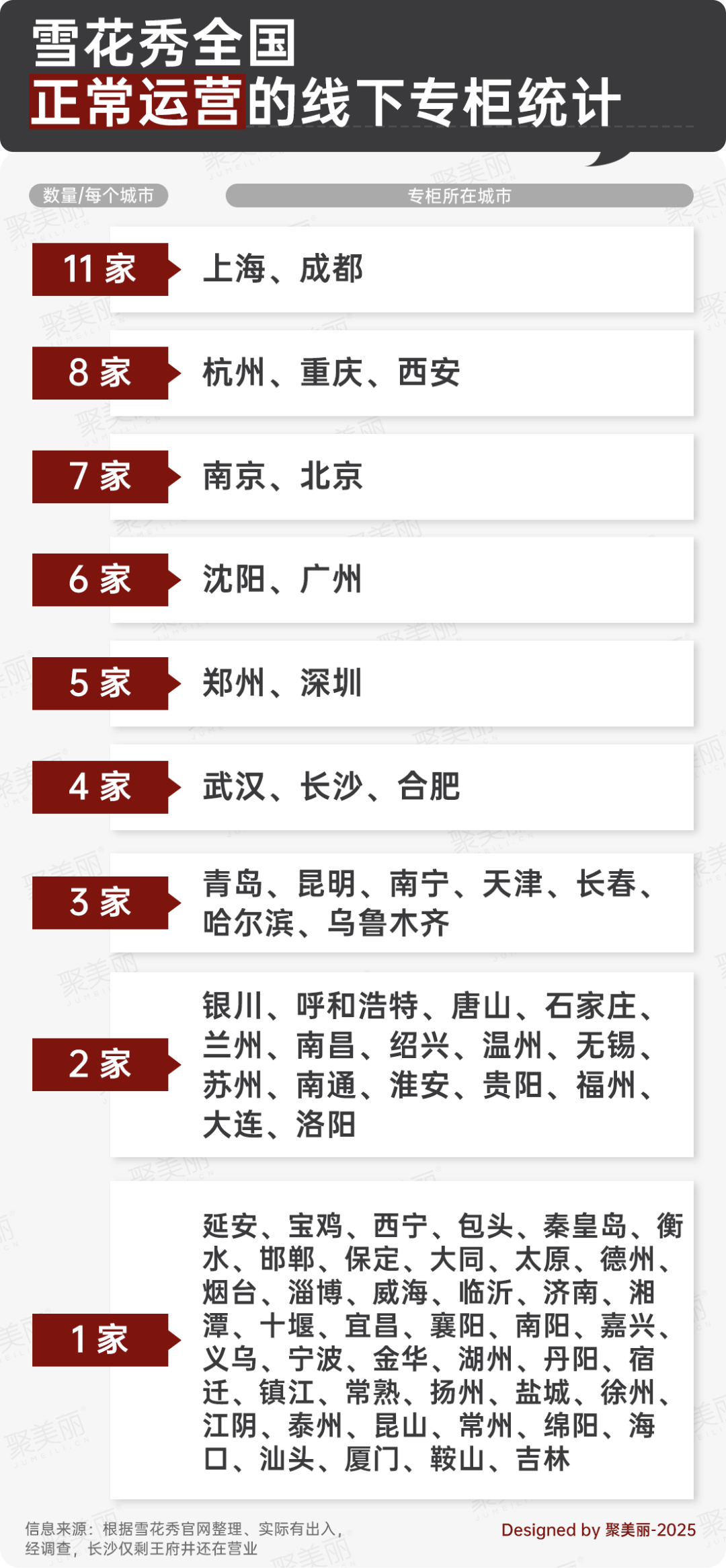 根據(jù)雪花秀官網(wǎng)披露的專柜信息,聚美麗梳理發(fā)現(xiàn),該品牌在中國(guó)市場(chǎng)的線下渠道仍維持著相當(dāng)規(guī)!采w全國(guó)超過80個(gè)城市,門店總數(shù)逾180家。這與前述店員的說法相符。