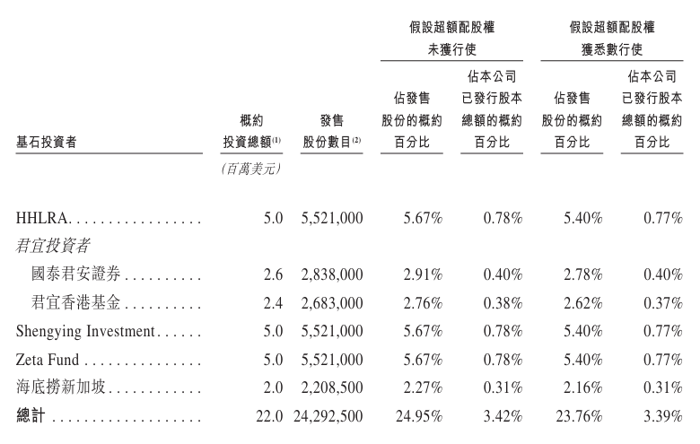 高瓴資本、海底撈、君宜資本、晟盈投資及Zeta Fund共同認購了總額約2200萬美元的發(fā)售股份。假如沒有行駛超額配股權,按最高發(fā)售價計算,這部分股份約占已發(fā)行股本總額的3.42%。
