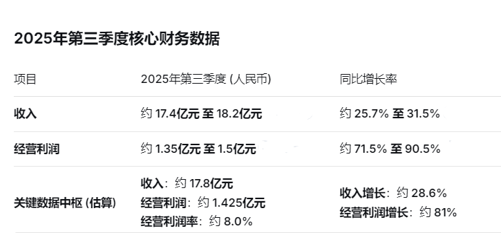 其2025年第三季度最新業(yè)務(wù)情況自愿公告中顯示,公司單季收入預(yù)計(jì)達(dá)到17.4億至18.2億元人民幣,同比大幅增長(zhǎng)約25.7%至31.5%。經(jīng)營(yíng)利潤(rùn)增速更為迅猛,較于2024年第三季度同比增長(zhǎng)約71.5%至90.5%。營(yíng)收和利潤(rùn)雙雙飆升,顯示出公司目前強(qiáng)勁的增長(zhǎng)動(dòng)能和盈利能力。