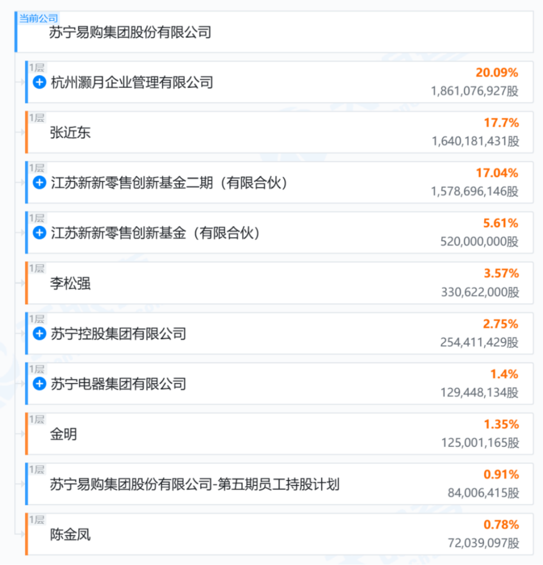 根據(jù)公開(kāi)信心和天眼查資料,蘇寧系主要就是三家母公司:蘇寧電器,蘇寧控股和蘇寧置業(yè),其中蘇寧電器也是蘇寧置業(yè)的大股東,而上市公司蘇寧易購(gòu)由阿里系資本、張近東、各大基金、蘇寧控股、蘇寧電器、員工持股控制主要股份,其余由公眾持股。