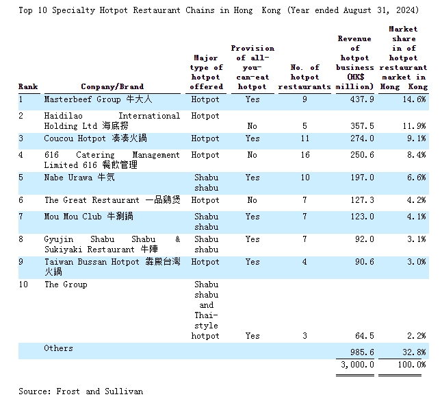 根據(jù)弗若斯特沙利文的報(bào)告,按2023年9月至2024年8月的收入計(jì),牛大人位列香港特色火鍋連鎖品牌之首,在整個(gè)香港火鍋賽道中的市場(chǎng)占有率達(dá)到14.6%。一品雞煲火鍋、泰金鍋分別排在第六和第十,市占率分別為4.2%和2.2%。