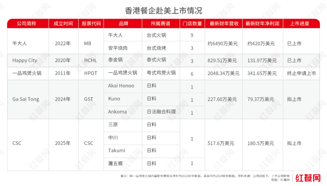 時(shí)間再往前,今年3月,在香港經(jīng)營(yíng)著6家門(mén)店的一品雞煲火鍋更新美股招股書(shū)(后于5月8日撤回上市申請(qǐng))。更早之前,牛大人(擁有牛大人、安平烤肉兩個(gè)品牌)、Happy City Holdings Limited(簡(jiǎn)稱“Happy City”,擁有品牌泰金鍋),已分別于今年4月、6月登陸美股。
