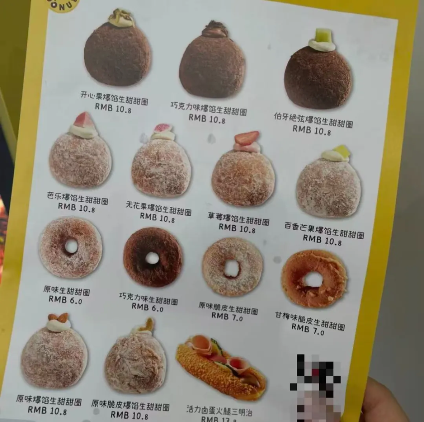 具體到產(chǎn)品與定價(jià)方面,甜甜圈門店目前有14個(gè)sku,13款為甜甜圈,還有1款為三明治。甜甜圈又分為爆餡生甜甜圈、生甜甜圈、脆生甜甜圈、脆皮爆餡生甜甜圈等不同種類,定價(jià)6-10.8元不等。