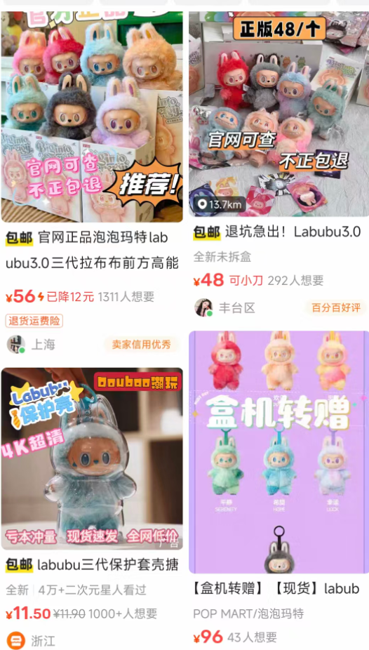 新一代Labubu4.0(心底密碼)系列則發(fā)售即巔峰,因大規(guī)模品控問題引發(fā)爭議,普通款在二手市場多數(shù)處于60-90元的價格區(qū)間,跌破發(fā)行價。即便是隱藏款,市價最高也僅有264元。