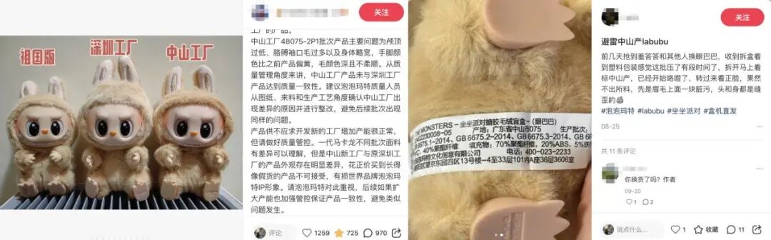 有消費者表示,這批品控飽受詬病的四代Labubu,多數(shù)產(chǎn)自廣東中山廠,亦有不少人發(fā)出了中山工廠的避雷貼。