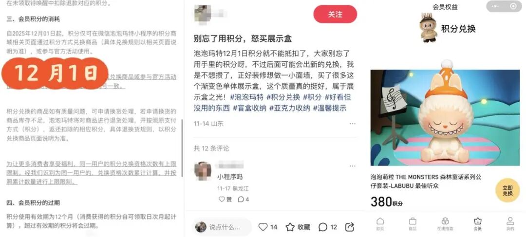 更有細心消費者發(fā)現(xiàn),泡泡瑪特的積分兌換現(xiàn)金的規(guī)則將在12月起取消,屆時積分僅可以在微信小程序的積分商城兌換部分商品。這一規(guī)則的取消,在一定程度上打擊了黃牛的積極性,新規(guī)則下黃牛再無法通過積分套利機制來減少虧損。