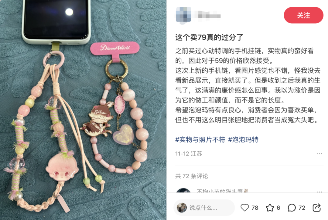 “之前買過Dimmo心動特調(diào)的手機掛鏈,實物真的蠻好看,59元也能接受。新品不僅漲價了,而且滿滿廉價感。”一位購買了Dimmo手機掛鏈的消費者吐槽道。另一位消費者也表示,“之前買Dimoo手機鏈就是因為實用,49-59元的定價也相對劃算,怎么現(xiàn)在都跟普通盲盒一個價了?