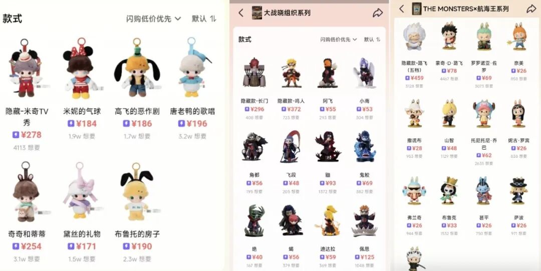 第三,泡泡瑪特還在嘗試通過聯(lián)名,再次推動“爆款”的誕生。當下,Labubu與三麗鷗聯(lián)名的搪膠毛絨系列產(chǎn)品,還未上線已經(jīng)在社交媒體上引發(fā)大量討論和關(guān)注。此前,泡泡瑪特Dimoo與迪士尼聯(lián)名系列從今年3月發(fā)售至今,二手市場價格依舊穩(wěn)定維持在近200元的均價;與火影忍者和海賊王聯(lián)名系列產(chǎn)品手辦,則為泡泡瑪特拉入了更多二次元粉絲,實現(xiàn)了有效破圈。
