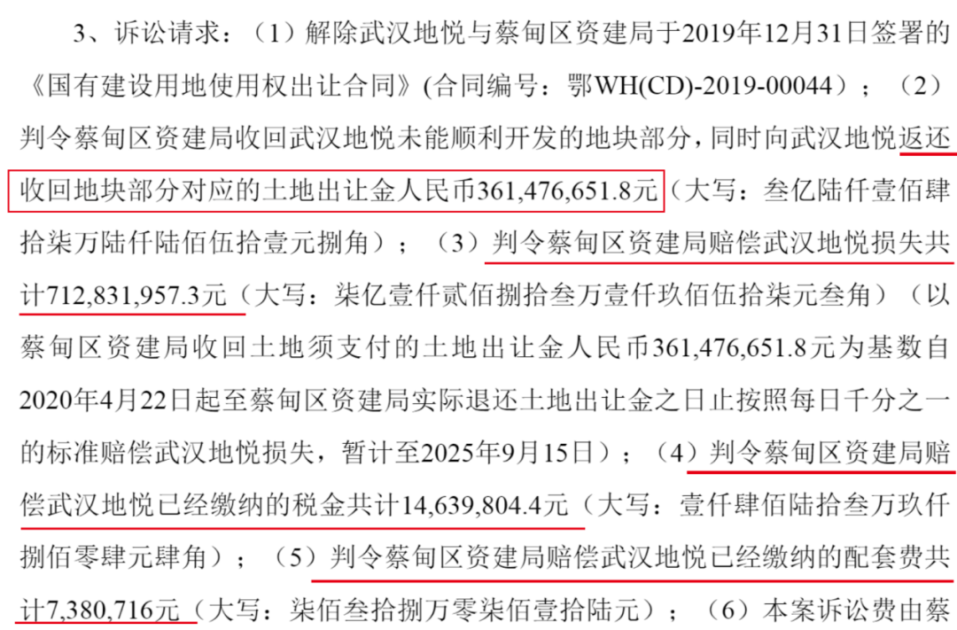 具體而言,武漢地悅訴求,蔡甸區(qū)資建局收回武漢地悅未能順利開發(fā)的地塊部分,同時返還收回地塊部分對應(yīng)的土地出讓金3.61億元。