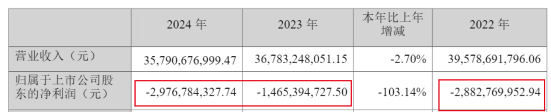 自此之后,大悅城更是一發(fā)不可收拾。2023年和2024年,大悅城的營收一路下滑,歸母凈利潤又分別虧損了14.65億元、29.77億元。